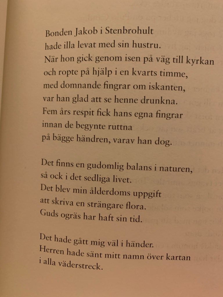 En annan av Espmarks dikter handlar om Carl von Linné och hans dokumentation/kategorisering av de folkslag och grupper han studerat, t.ex bonden Jakob: