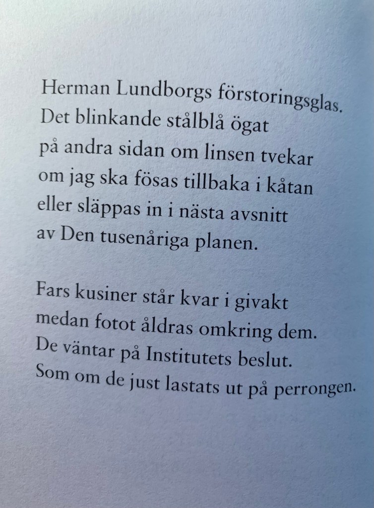 En av Espmarks dikter tar upp människans egen ”skapelse” rasbiologi, som kastar skuggor över dikt-jaget hundra år senare. Människorna som dokumenterades och kategoriserades 1931 ska få upprättelse i nutid, men övergreppen är förevigade på foton och plågar det nu levande dikt-jaget: