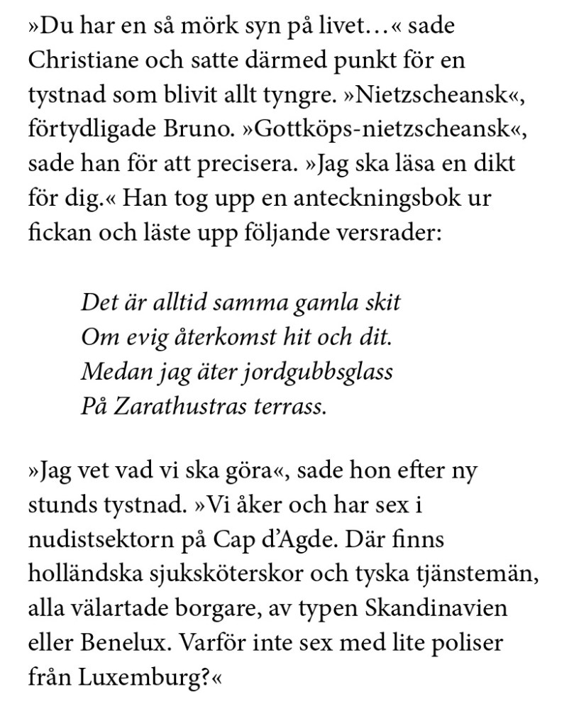 Växelvis berättas deras livshistorier av en allvetande berättare. Ett tag tar historien om Bruno över, men i slutänden handlar det lika mycket om båda bröderna. Jag blir mycket berörd av berättelsen om dem; det är oändligt sorgligt (separationer, olyckor, död), provocerande (n+f+k-ord i tanke och dialog, incest, pedofili, gubbsjuka), erotiskt – och humoristiskt samt filosofiskt. Mycket kan rymmas på en och samma sida: