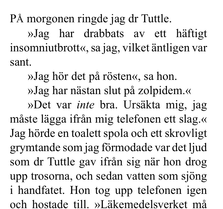 Med rekvisita som George W Bush, Tommy Girl-parfym, personsökare, piercings och Kate Moss väcker Moshfegh mina millennieminnen till liv. Alva Dahl har skickligt översatt romanen till svenska; texten känns skriven på originalspråk. Den liknar lite Sylvia Plaths Glaskupan (+ ännu mer av gränsöverskridanden – och minus Plaths poetiska språk).