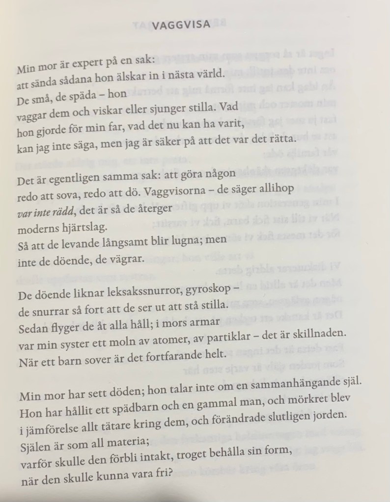 Diktjagets mor har sett döden och beskriver själen som ”ett moln av atomer”. Tranströmerskt omkast i slutet av dikten: Varför skulle den [själen] förbi intakt […] när den skulle kunna vara fri? (”Själen är som all materia”)